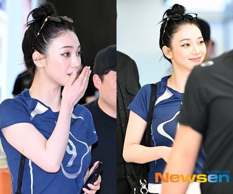 이날 카리나는 올백으로 깔끔하게 묶은 헤어스타일로 독보적인 얼굴선을 드러냈다. 카리나의 작고 갸름한 얼굴이 감탄을 자아냈다. 여기에 카리나는 네이비톤 티셔츠로 스포티한 매력을 더했다.
