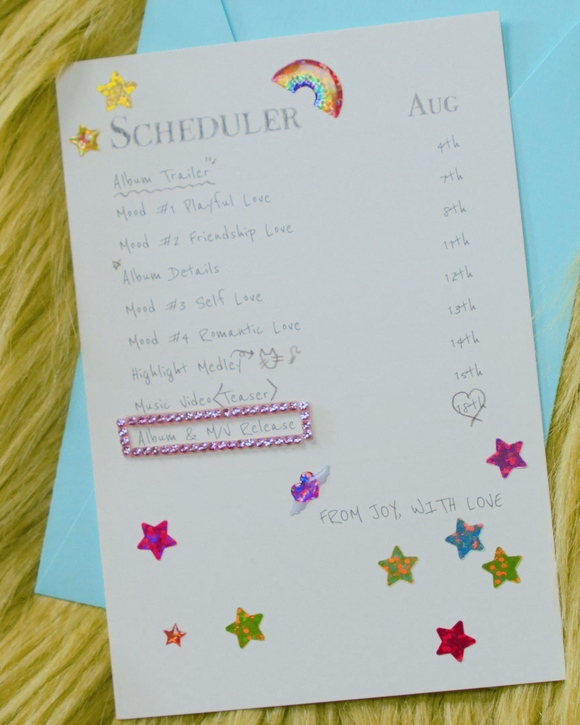 파스텔 컬러 봉투와 알록달록한 스티커 장식으로 청량하고 사랑스러운 콘셉트가 돋보이는 스케줄 포스터에는 다채로운 티징 콘텐츠 일정이 담겨 눈길을 끈다. 이에 따르면 조이는 오는 8월 4일부터 앨범 트레일러를 시작으로 네 가지 무드의 티저 콘텐츠, 하이라이트 메들리, 뮤직비디오 티저 영상 등을 순차적으로 공개한다.