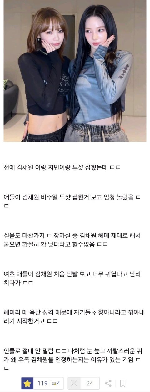 걸플갤 개저씨들은 김채원이 카리나랑 비교될 구석이 진짜 있다고 믿는건가...? 코첼라 사건 때문에 뇌에 이상 생긴거 아님?????