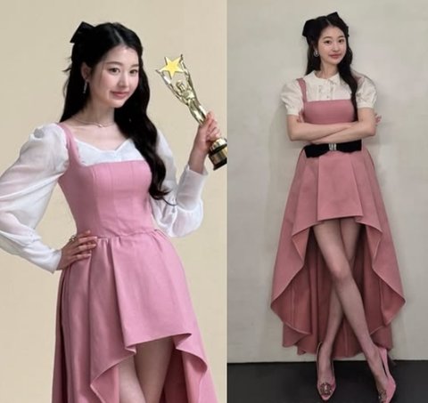 앞은 짧고 뒤는 길게 떨어지는 하이로우 디자인의 드레스는 특유의 청순하면서도 발랄한 매력을 배가시켰고, 블랙 리본 벨트로 허리 라인을 강조하며 실루엣의 완성도를 높였다.