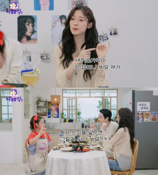 제일 마음에 들었던 포즈로 손가락을 가볍게 접는 포즈를 공개한 아린은 “제니 씨를 상상하면서 시크하게 했는데 제가 새끼손가락이 안 접히나 보다. 다 사진이 안 접힌 상태로 나왔다”라고 설명했다. 이에 이수혁은 “느낌을 넣으면 그렇게 되나 보다”라고 반응했다.
