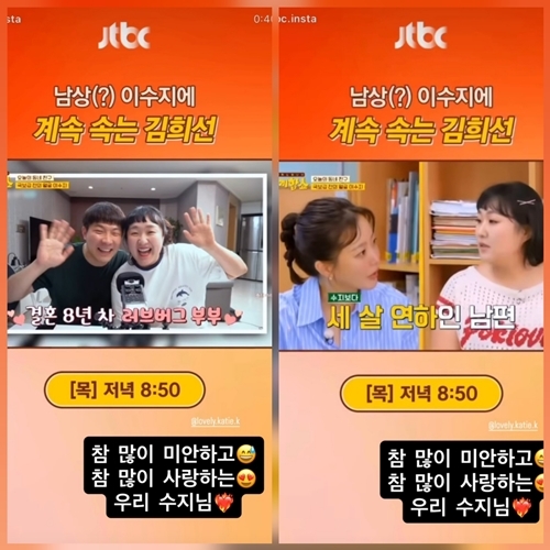 해당 방송에는 김희선, 탁재훈, 이수지가 함께 출연해 이수지의 모교인 선일여중을 방문했다. 학창시절을 회상하며 웃음을 나누던 중, 김희선은 이수지에게 “결혼했냐”고 물었고, 이수지는 남편과 찍은 사진을 꺼내 보였다.