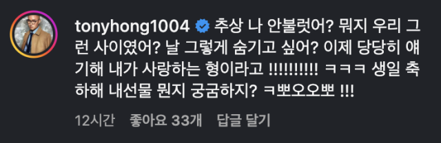 방송인 홍석천의 댓글. / 추성훈 인스타그램 캡처이 가운데 눈길을 끈 것은 방송인 홍석천의 댓글이었다. 그는 "추상 나 안 불렀어? 뭐지, 우리 그런 사이였어? 날 그렇게 숨기고 싶어?"라며 장난 섞인 서운함을 표현했다. 이어 "이제 당당히 얘기해, 내가 사랑하는 형이라고 !!!!!!!! ㅋㅋㅋ 생일 축하해"라고 너스레를 떨며 "내 선물 뭔지 궁금하지? ㅋ뽀오오뽀!!!"라고 덧붙여 웃음을 자아냈다.