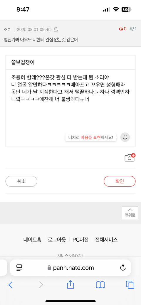 예쁘고 잘나면 부럽고 배아파서 정신병원 가보라고ㅋㅋㅋ