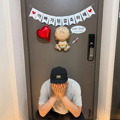 공개된 사진에는 '아빠가 된 걸 축하해'라는 문구가 붙어있는 문 앞에서 두 손을 얼굴을 감싸쥔 채 감격하고 있는 양현민의 모습이 담겨 있다.