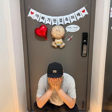 공개된 사진 속 양현민은 얼굴을 감싸안은채 현관 앞에 주저앉아 감격을 드러내고 있다. 현관에는 '아빠가 된 걸 축하해'라는 글귀와 아기 모양의 풍선, 임신 테스트기 등이 붙어있다.