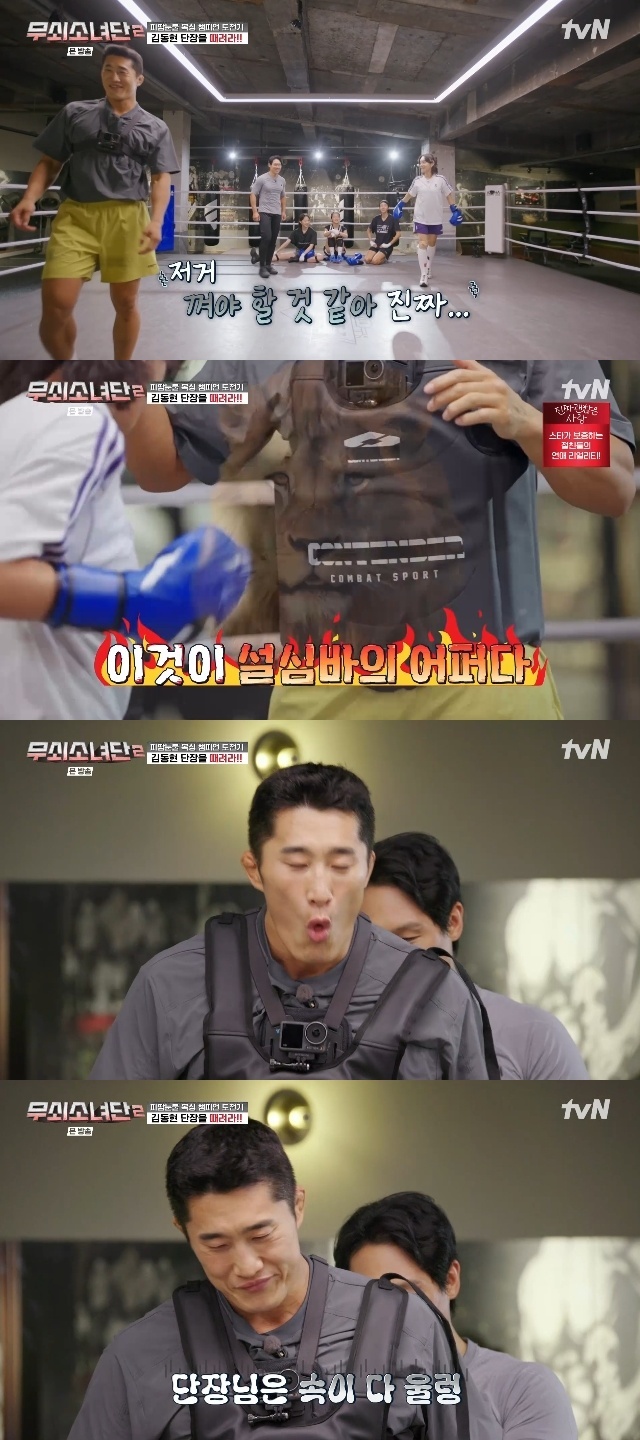 tvN ‘무쇠소녀단2’ 캡처이 말에 멤버들은 "잔인하다", "너무 아프겠다"며 경악했는데 김동현은 "제가 여러분의 샌드백이 되어 맞아보겠다"고 단장으로서 훈련을 돕겠다고 나서 눈길을 끌었다. 심지어 그는 장비도 필요 없다며 "원래 선수들은 맞아주고 연습한다. 선수 때 생각이 나는 게 무거운 공 던지고 올라가서 3분 동안 밟는다. 90, 100㎏이 밟는다. 그거에 비하면 여러분 주먹은 솜사탕이라고 생각된다"고 말했다. 설인아는 이에 "자존심 상하네"라며 욱했고, 김동현은 "하다가 제가 졸 수 있다. 깨워달라"고 더 오버해서 깐족거렸다.