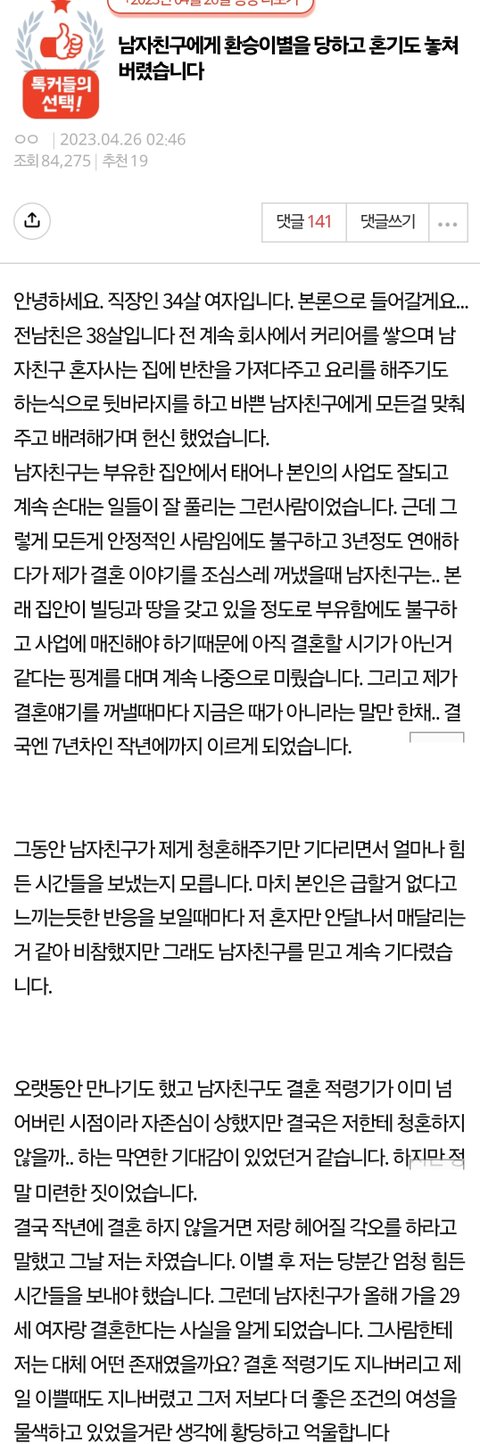 돈없고 힘없는 여자 잠자리용+가정부로 갖고놀다가 결국 어리고 예쁜 여자한테 갈아탄건 남자인데 댓글창 보면 남자고 여자고 글쓴이 욕만 신랄하게 하더라. 인정하기 싫지만 여자가 34살에 아예 처음부터 소개팅하고 다른남자 찾아야하는 상황이면 인생 조진거 맞는데