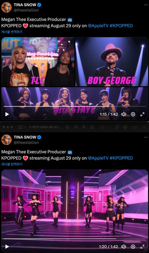 애플TV+ 8/29부터 'KPOPPED' 방송. 8개 에피중 6번째가 스테이씨 + TLC + 보이조지. 노래는 런투유 + 워터폴 + 카르마 카멜레온. 작년 11월 GPT 활동때 찍음