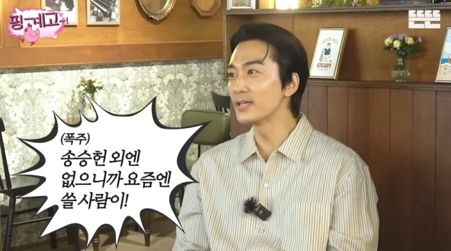 ▲ 출처|유튜브 뜬뜬 핑계고 캡처송승헌은 "송승헌 외엔 없으니까, 요즘엔 쓸 사람이! 쓸 사람이 없는데"라고 재차 강조에 나섰다. 엄정화는 "자기 외엔 없대"라며 다시 폭소했고, 유재석은 "이 사람 대단하네"라고 감탄했다.