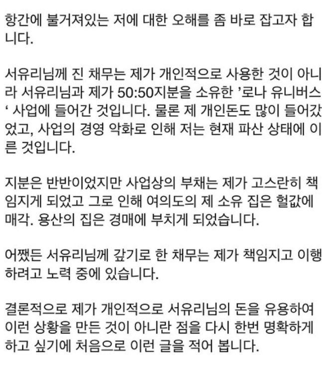 끝으로 "어쨌든 서유리님꼐 갚게로 한 채무는 제가 책임지고 이행하려고 노력 중에 있습니다. 결과적으로 제가 개인적으로 서유리님의 돈을 유용하여 이런 상황을 만든게 아니란 점을 다시한번 명확하게 하고싶기에 처음으로 이런 글을 적어봅니다"라며 글을 마무리했다.