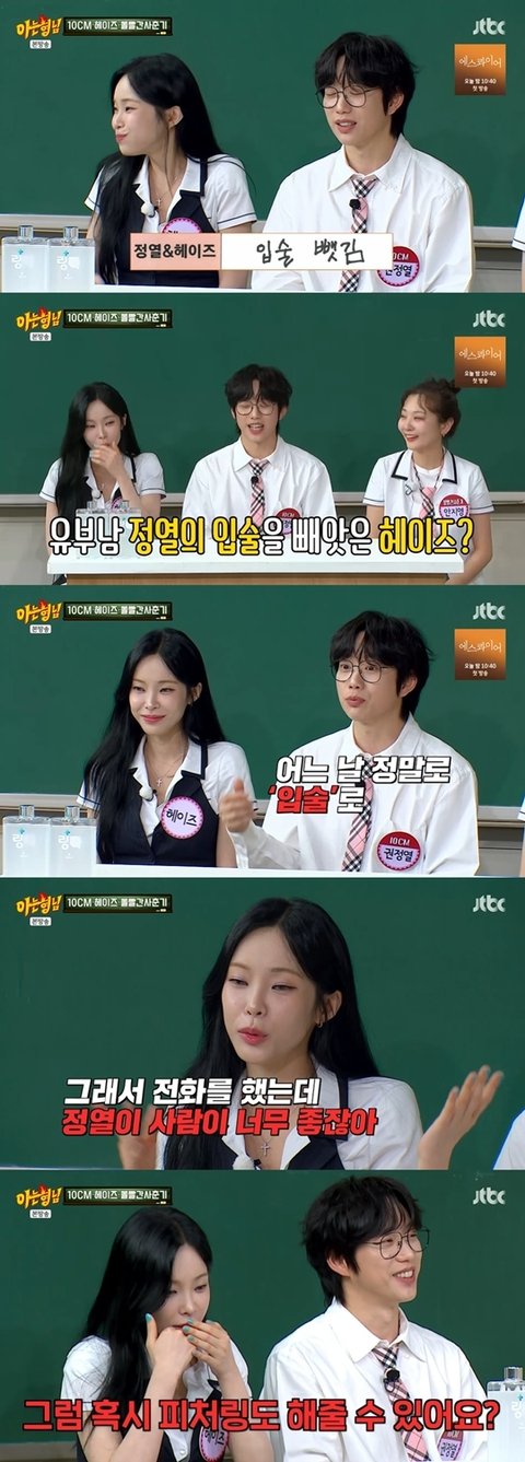 이어 헤이즈와 안지영의 인연이 공개됐다. 헤이즈는 “시상식에서 안지영을 처음 만났다. 너무 귀엽고, 너무 사랑스럽더라. ‘뽀뽀하고 싶다’는 생각이 들었다”며 “합동 무대를 마친 후 ‘너에게 뽀뽀를 하겠다’며 미리 언질을 했다”고 밝혔다.