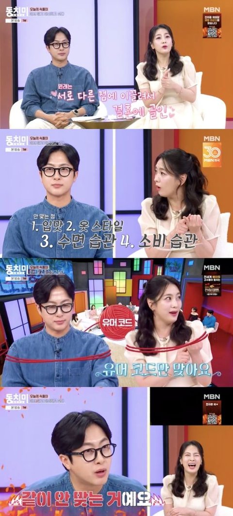 정미녀는 “안 맞는 부분이 좋아서 결혼을 했다. 결혼을 하고 나니까 먹는 것, 입는 것, 자는 것, 돈 쓰는 것이 안 맞는다. 유머 코드만 맞는다”라고 말했다. 전민기는 “피해자처럼 말하는데 같이 안 맞는 것이다. 나도 안 맞다”라고 맞불 작전을 펼쳤다.