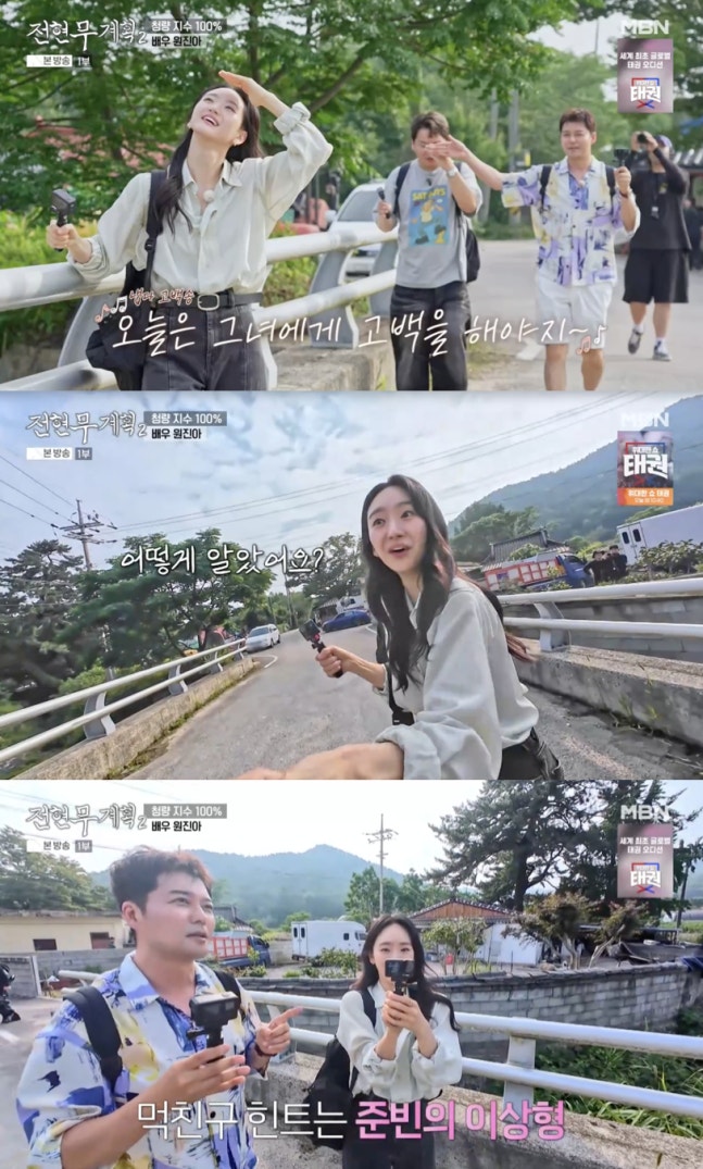 /사진='전현무계획2' 방송화면 캡쳐원진아 만나기 직전, 전현무는 "(너가) 아이유와 원진아 두 명을 얘기했다"라고 쪼자 곽준빈은 "고윤정 씨일 수도 있는 거 아니냐"라며 행복한 고민에 빠졌다. 이에 전현무는 "혹시 원진아 씨가 나오면 '오! 나의 100% 이상형 원진아 씨~'라고 외쳐라"고 과한 요청을 해 그를 긴장케 했다.직후 세 사람이 만난 가운데, 눈을 가린 곽튜브는 "오! 나의 원진아 씨~"라고 외치고, 원진아는 "(나인지) 어떻게 알았냐"며 깜짝 놀라했다.