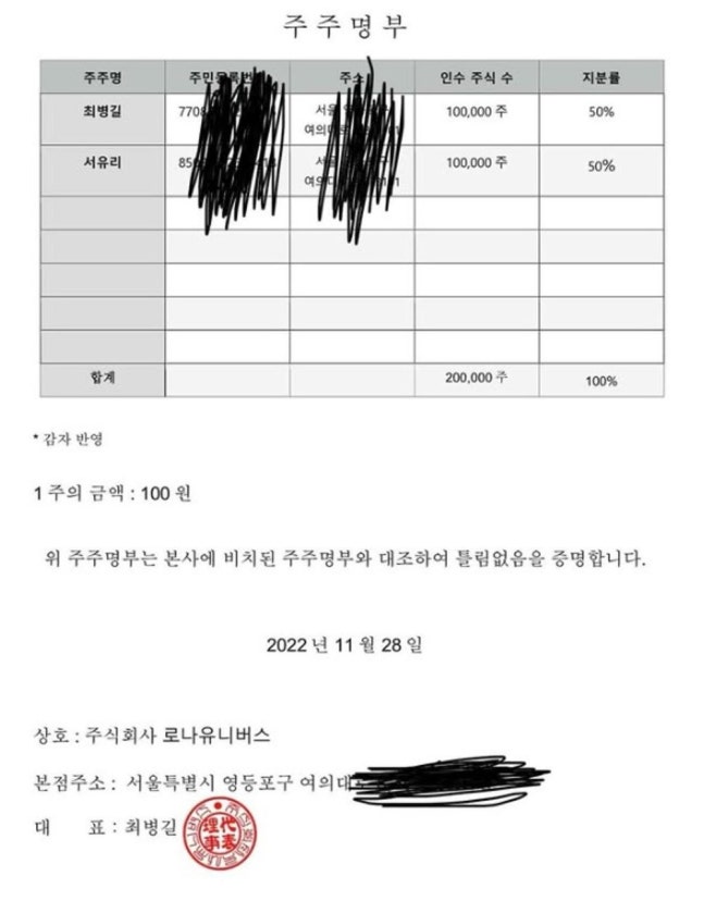 최PD는 3일 자신의 소셜 계정에 "이건 내가 갖고 있는 최신 주주 명부다. 부대표가 당신 지분이 없다고 얘기했다? 그 사람은 열 받으면 별소리도 다하는 사람이다. 나도 지긋지긋했던 거 누차 얘기했다. 나 역시 적자투성이인 회사에서 법인카드로 내 개인 음료수 하나 사먹은 적이 없다"면서 서유리가 주주로 등록된 주주명부를 공개했다.