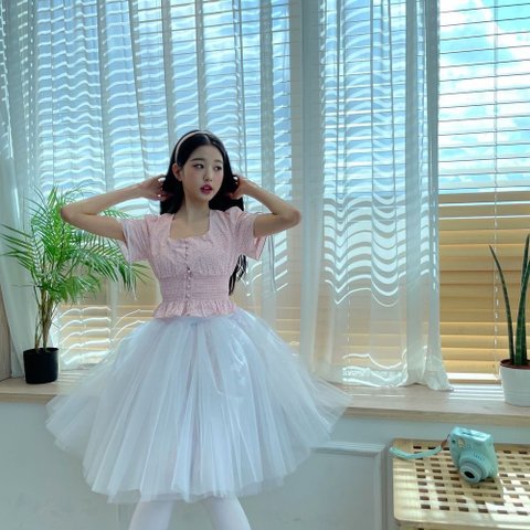 ‘사람이 이렇게 생겨도 되나?’ 싶을 정도의 비주얼 폭발 살랑살랑 퍼지는 하얀 치마 + 하늘하늘 핑크 블라우스 + 긴 생머리에 머리띠까지… 진짜 발레연습 끝나고 막 나온 프린세스 같아요 실내 자연광+커튼+식물까지 분위기 완성…= 그냥 임.