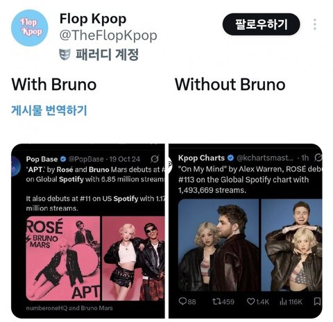 위로 먹금해 니눈엔 케이팝 방탄이랑 에스파만 보이나본데 저기 사진에 있는 사람들이 다 필터링된거고 레이디가가 콜플 엘튼존 올리비아로드리고 유명한 가수 많고 슈퍼볼 선 캔드릭라마나 앨범 대박난 sza 버나보이 도이치도 최근까지 청취자수나 스트리밍 크게 삭제됨 케이팝은 팬덤이 무료계정으로 팬덤스밍하는 경우가 많음 하이브 슴 아니면 이글 누가 썼을까?