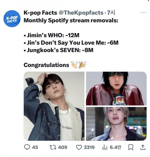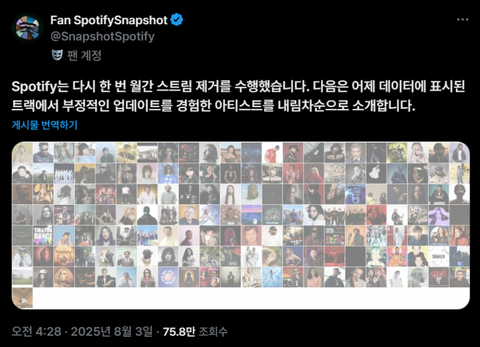 누가보면 스포티파이 공계에서 마치 그런것처럼 또또 주작질하네 정작 불법 퇴출된건 ㅅㅍㅇ이고 방탄은 스포티 프로모조차 안하는데 내수원툴 열등감에 사로잡혀서 맨날 스포티 빌보드는 조작이고 동네차트라고 역바에 돈쏟아부으면 뭐달라짐ㅋ