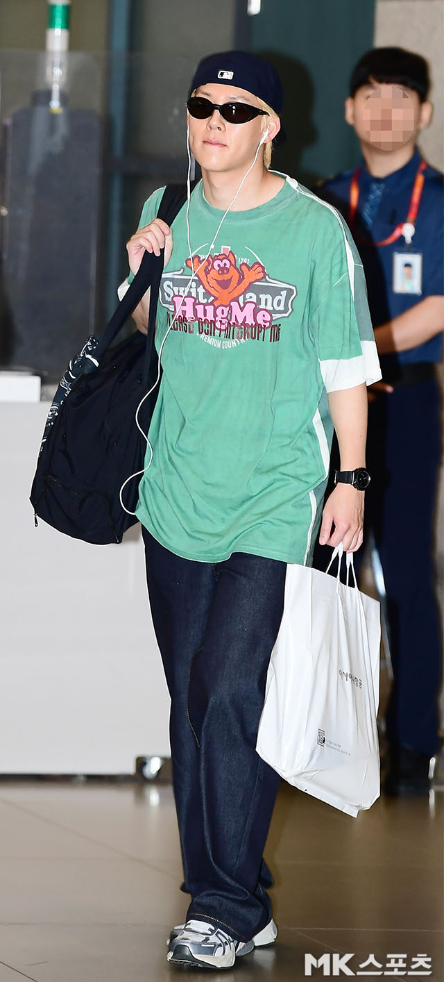 사진 속 주헌은 블론드 헤어에 이어폰을 착용한 채 등장했다. 특별한 포즈 없이도 자연스럽게 등장한 모습은 실제 귀국길의 리얼리티를 살렸고, 한 손에는 쇼핑백을, 다른 손에는 백팩 스트랩을 든 채 등장하며 일상적인 꾸안꾸 감성을 전했다.전체적인 착장은 루즈핏 중심. 여유 있는 티셔츠와 진청 데님 팬츠의 조합은 답답하지 않으면서도 자연스럽게 떨어졌다. 여기에 빈티지한 러닝화가 더해지며 활동성까지 겸비한 공항룩을 완성했다.