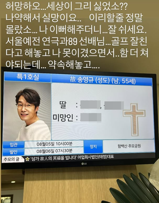 이어 그는 "골프 잘 친다고 해놓고 나 못 이겼으면서... 함 더 쳐야 되는데... 약속해 놓고"라며 절친한 선배를 떠나보내는 비통한 심경을 전했다.