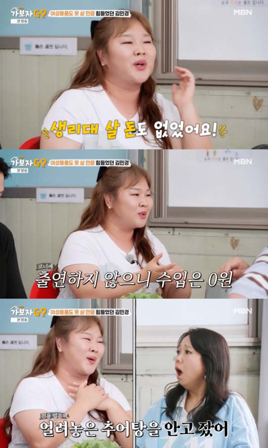 데뷔 당시에 대해 “길거리 공연도 많이 하고 대학로 공연도 오래하고 그랬다. 데뷔해도 계약금이 없었다. 여자들은 한 달에 한 번 마법에 걸리지 않냐. 생리대 살 돈이 없었다. 출연해야 출연료를 받으니까 수입이 없었다. 알바를 할수가 없는게 회의실에 하루 종일 있으니까 아르바이트도 할 수 없었다”고 회상했다.