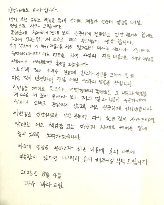 5일 바다는 자신의 계정에 "이번 일로 실망하셨을 모든 분들께 다시 한번 깊이 사과드리며, 앞으로는 더욱 책임감 있는 자세로 여러분 앞에 설 수 있도록 노력하겠다"라는 글과 함께 자필 사과문을 게시했다.