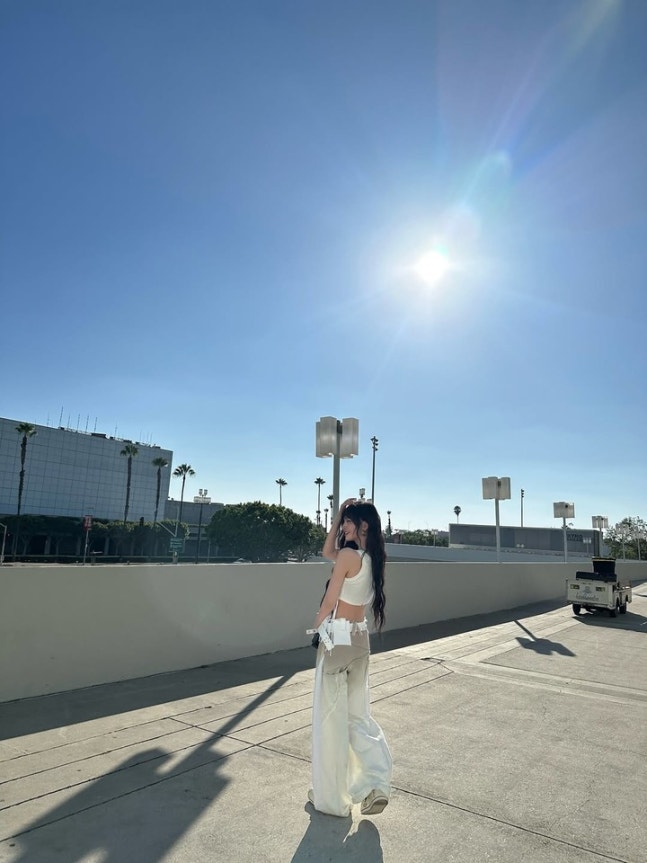 리즈의 우아한 뒷모습과 함께 햇살 아래서 느껴지는 여유로운 분위기가 극대화됐다. 화이트 톱과 와이드 팬츠는 그의 심플하면서도 편안한 스타일을 보여주며, 햇빛이 리즈의 실루엣을 강조한다.