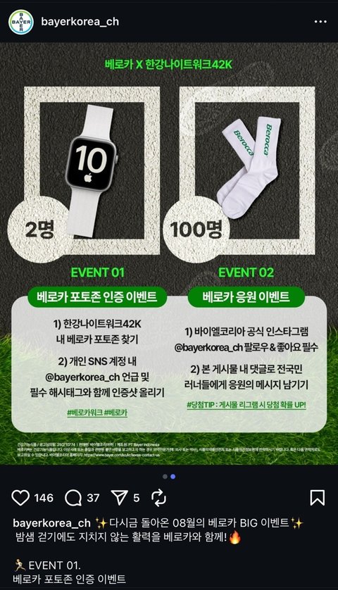 한강나이트워크25 다녀온 분? 8월 10일까지 바이엘코리아 인스타에서 '한강나이트워크 베로카 포토존 인증샷' 이벤트랑댓글이벤트같은거 하고 있어요