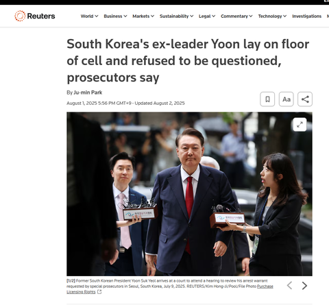 전 대통령은 지난 7월 서울 구치소의 독방에 다시 수감되었으며, 12월 그의 단기 계엄령 선포를 수사하던 검찰이 그에 대한 추가 기소를 요구했습니다.윤 대통령은 이미 사형 또는 종신형에 처해질 수 있는 반란 혐의로 재판을 받고 있다.그는 또한 부부가 선거에 부적절한 영향력을 행사한 혐의로 그의 아내인 김건희 전 영부인을 둘러싼 스캔들에 대한 스캔들을 포함하여 특별검사가 주도하는 일련의 다른 조사에 직면해 있습니다.https://www.reuters.com/world/asia-pacific/south-koreas-ex-leader-yoon-lay-floor-cell-refused-be-questioned-prosecutors-say-2025-08-01/
