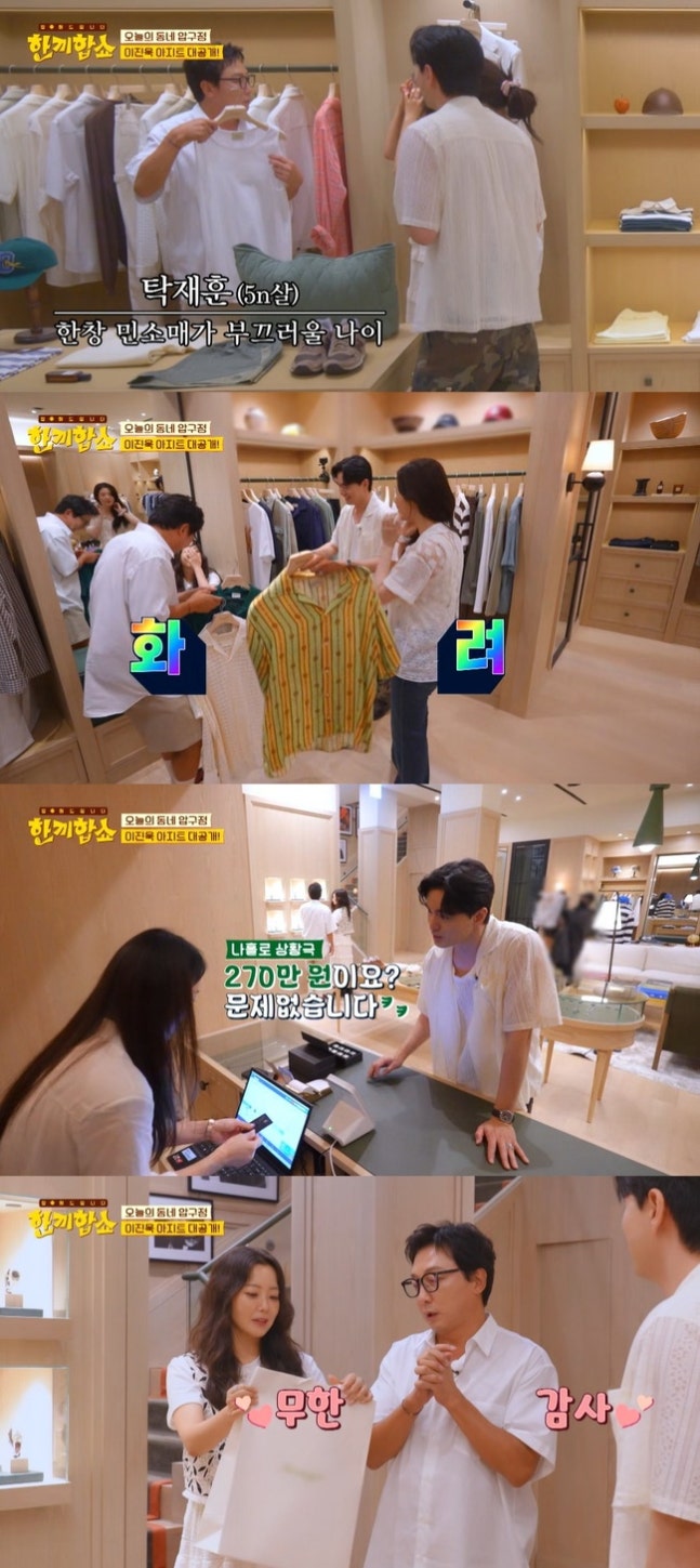 탁재훈이 최종적으로 고른 의상은 화이트 남방. "결제하고 오겠다"며 당당하게 계산대에 선 이진욱은 "270만 원? 형님을 위해서라면 문제없다"며 가격을 올려 나 홀로 상황극을 펼쳤다.