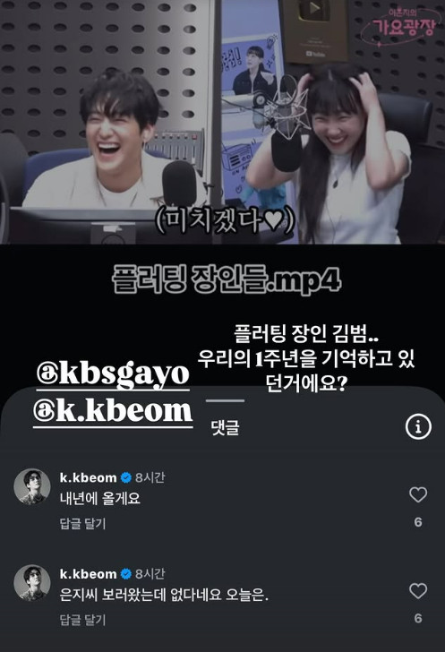 해외 스케줄로 인해 이은지가 DJ석을 비우자 아쉬움을 토로한 것. 이에 이은지는 김범의 댓글을 캡처해 "플러팅 장인 김범‥ 우리의 1주년을 기억하고 있던 거예요?"라며 SNS에 공유, 김범은 "자리에 없던데. 나만 진심이었지 또"라고 답하며 핑크빛 케미를 이어나갔다.