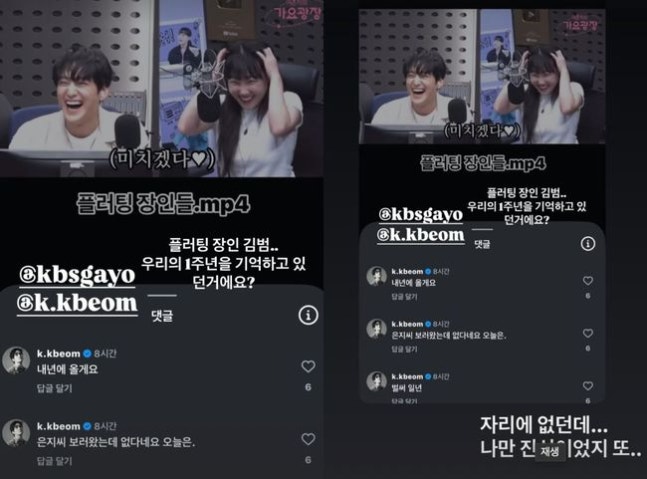 당시 라디오 출연 모습이 담긴 영상에 김범은 1년이 지난 2025년 8월 5일, "벌써 일년. 은지 씨 보러왔는데 없다네요 오늘은", "내년에 올게요"라는 댓글을 달았다. 이를 발견한 이은지가 댓글창을 캡처해 SNS에 공유한 것.