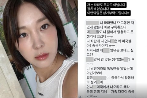 DM엔 "너 좌파였냐. 그동안 재밌게 봤는데 구독 취소다" "애들도 너 닮아서 멍청하고 못 생기게 크겠다" "좌파지만 애는 영어유치원 보내고 싶냐" "중국 가서 활동해라" 등 인신공격성 글과 입에 담지 못할 수준의 욕설이 담겼다.