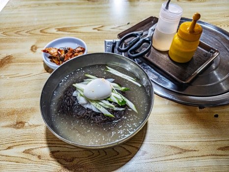 운동 후 칡냉면을 먹었는데 일반 냉면보다 면이 더 쫄깃하고 찰지다.