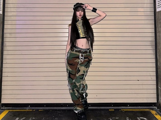 사진 속 민니는 블랙 밀리터리 콘셉트의 스타일링으로 강한 인상을 남겼다. 체인 디테일이 들어간 블랙 캡과 금장 숄더 태슬이 장식된 크롭 베스트를 착용했으며, 길게 늘어뜨린 생머리는 전체적인 카리스마를 배가시켰다.