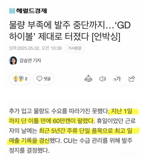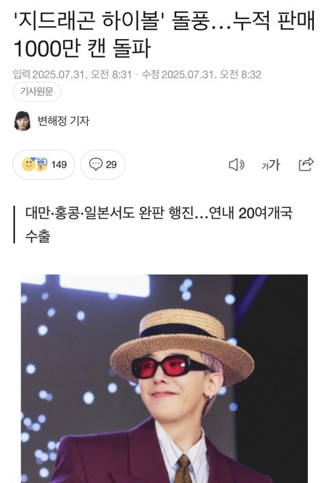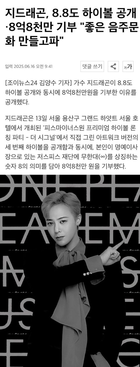 지드래곤 피마원 하이볼 3달 누적 판매량 1000만