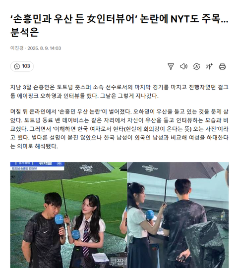 비가 오니 리포터가 본인이 비 안 맞으려 우산 들고 나온 거지 손흥민 비 맞지 않게 하려고 우산 들고 나온 건 아닐 건데 왜 손흥민을 비난하는지?