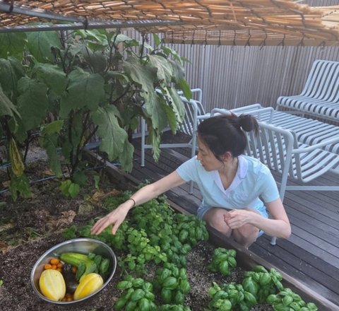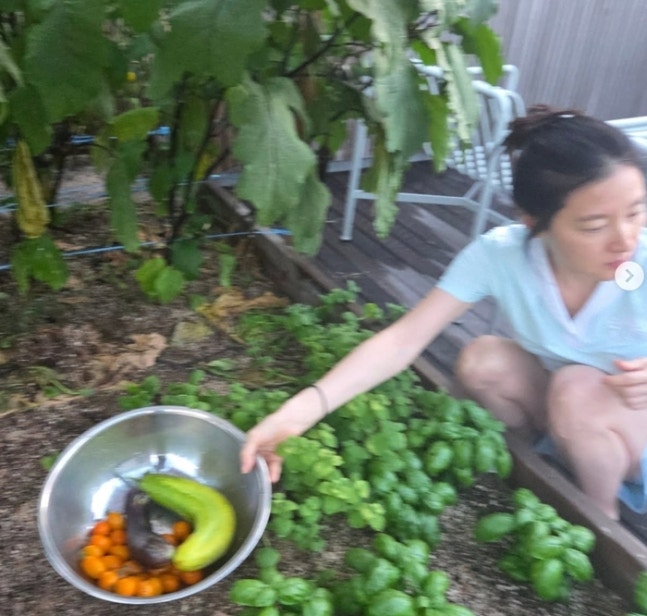 공개된 사진에는 이영애가 텃밭에서 직접 기른 채소를 따고 있는 모습이 담겨있다.