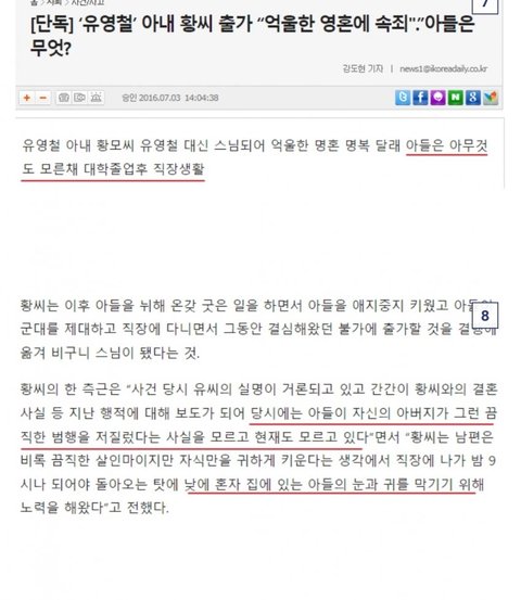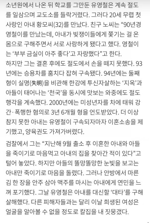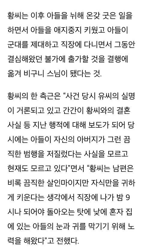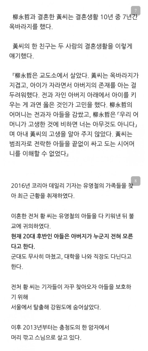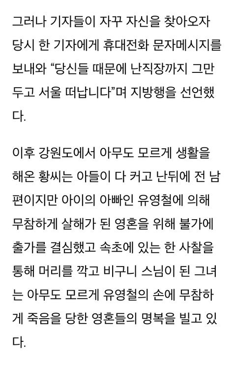 블로그 돌아다니다가 우연히 살인마 유영철 전부인 사연 접하게 됐는데 가난하고 빽없어서 어린나이에 남편 잘못만난탓에 자기가 저지르지도 않는 전남편 죄까지 대신 떠안고 평생을 비구니로 속죄하며 산다는게 너무 허무하고 어이없노.. 따지고보면 저 사람도 그저 운에 휩쓸려서 사람 잘못만난 죄밖에 없는데