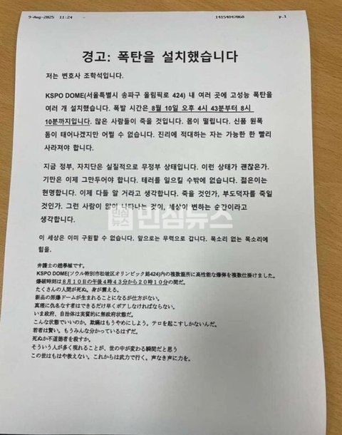 서울 송파구 올림픽공원 KSPO돔에서 폭발물 설치 협박 사건이 발생해 더보이즈의 공연이 중단되고 관객 전원이 긴급 대피했다. 10일 오후 1시 45분경, 운영사인 한국체육산업개발 측이 ‘고성능 폭탄을 여러 곳에 설치했다’는 팩스를 수신하자 즉시 경찰에 신고했다.