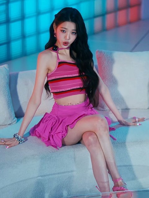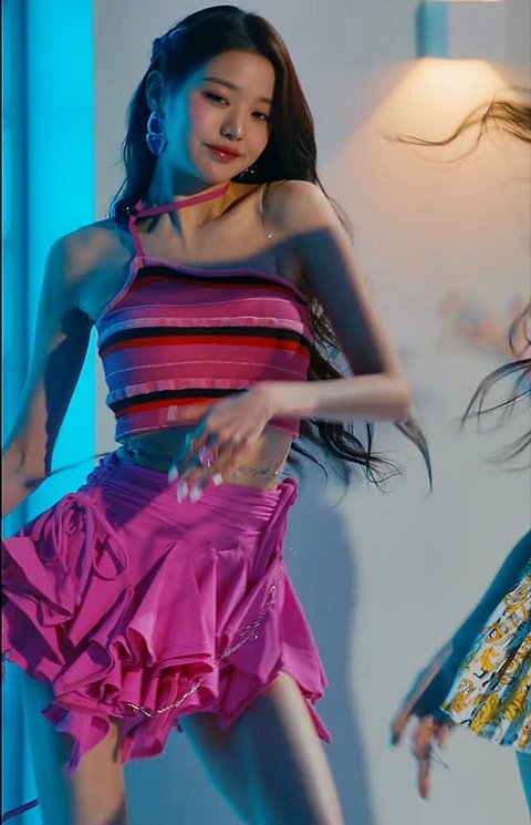 IVE(아이브)의 장원영이 일본 싱글 ‘Wave’ 뮤직비디오에서 춤을 추고 있는 장면으로 보입니다. 장원영 특유의 긴 팔다리와 슬림한 체형이 돋보이며, 화려한 핑크 컬러의 톱과 프릴 미니 스커트, 그리고 헤어 액세서리와 핑크 메이크업까지 MV 콘셉트에 맞게 여름 분위기와 활력을 전하고 있어요. ‘Wave’ 뮤직비디오 속 장원영은 특히 비주얼+댄스 퍼포먼스+무드 장악력이 모두 절정이라는 평가를 받았죠.