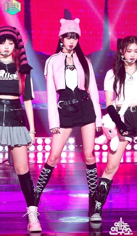 걸크러시 + 인형미가 공존하는 룩; 핑크의 러블리함과 블랙의 강렬함이 Baddie 컨셉에 잘 어울림; 키가 큰 장원영의 비율과 롱다리 + 니삭스 조합으로 무대에서 실루엣 극대화; Y2K 스타일을 현대적으로 재해석한 대표 무대의상 중 하나직캠 화질이 매우 좋고, 조명과 원영의 표정, 제스처가 완벽하게 포착됨;;; 팬들 사이에서도 ‘레전드 직캠’으로 불림