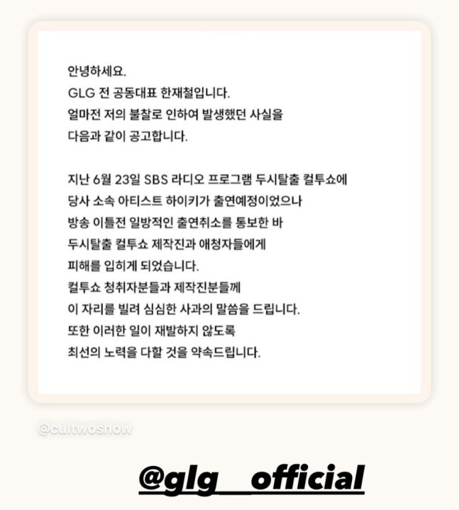 [스포츠조선닷컴 박아람 기자] 그룹 하이키(H1-KEY)의 전 소속사 대표가 SBS 파워FM '두시탈출 컬투쇼' 출연 취소 논란과 관련해 공식 사과했다.11일, 하이키의 전 소속사 GLG(Global K-pop Label)의 한재철 전 공동대표는 입장문을 통해 "얼마 전 저의 불찰로 인해 발생했던 사실을 공고한다"며 "지난 6월 23일 SBS 라디오 프로그램 '두시탈출 컬투쇼'에 당사 소속 아티스트 하이키가 출연 예정이었으나, 방송 이틀 전 일방적으로 출연 취소를 통보한 일이 있었다"고 밝혔다.