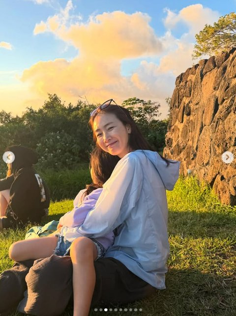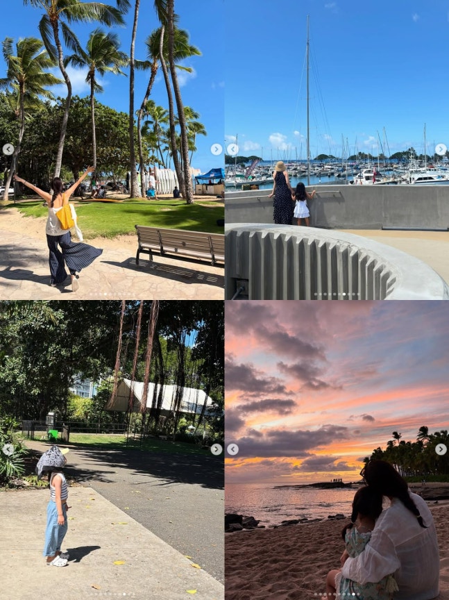 사진 속 최지우는 잔디밭에 앉아 딸을 끌어안고 행복한 미소를 짓고 있는 모습. 수수한 민낯에도 완벽한 비주얼을 완성한 최지우는 딸과 나란히 앉아 노을을 바라보거나 바닷가에서 여유로움을 즐기며 여름 휴가를 만끽하고 있다.