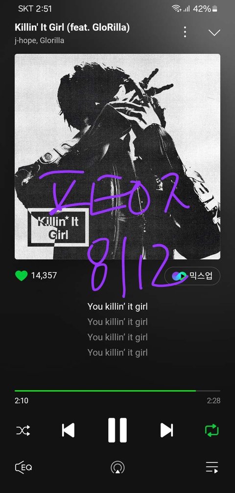 킬링잇걸 들으면 눈에 자켓만 입은 호비등장에 초면인 옆자리 아미랑 대동단결로 앓았던 순간이 생각나 심장이 쿵쿵쿵 에코앨범 통으로 맨날 듣는데 매순간 다 기억나