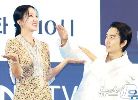 배우 엄정화와 송승헌(오른쪽)이 12일 오후 서울 구로구 경인로 신도림 디큐브시티 더 세인트에서 열린 지니 TV 오리지널 '금쪽같은 내 스타'(극본 박지하/ 연출 최영훈)의 제작발표회에 참석해 포즈를 취하고 있다. '금쪽같은 내 스타'는 대한민국 최고의 톱스타가 하루아침에 평범한 중년 여성이 된 후 펼쳐지는 눈물 콧물 휘날리는 세월 순삭 로맨틱 코미디다. '미쓰 와이프' 이후 10년 만에 재회한 엄정화, 송승헌이 완성할 로맨틱 코미디에 이목이 집중되고 있다. 2025.8.12/뉴스1 ⓒ News1 권현진 기자