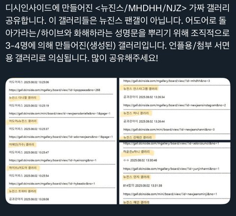=어도어와 화해를 촉구하는 뉴진스 팬 연합 성명문이 올라왔는데 그 팬 연합이라는 것이 같은 날 생성된 디씨갤러리들.