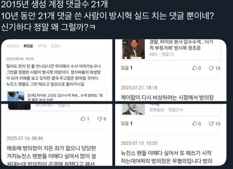 방시혁 기사마다 뉴진스 욕하며 방시혁 옹호하던 계정 기록 보니 2015 생성 계정임에도 불구하고 단 댓글이 방시혁 옹호 댓글 밖에 없음