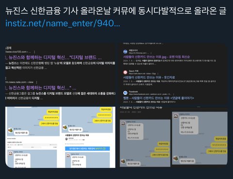 작년 7월 신한은행 광고를 뉴진스가 맡자마자 ㅍㅋ, ㄷㅇㅋㅍ, ㄷㅋ 등에 신한은행 까는 글들이 동시다발적으로 업로드