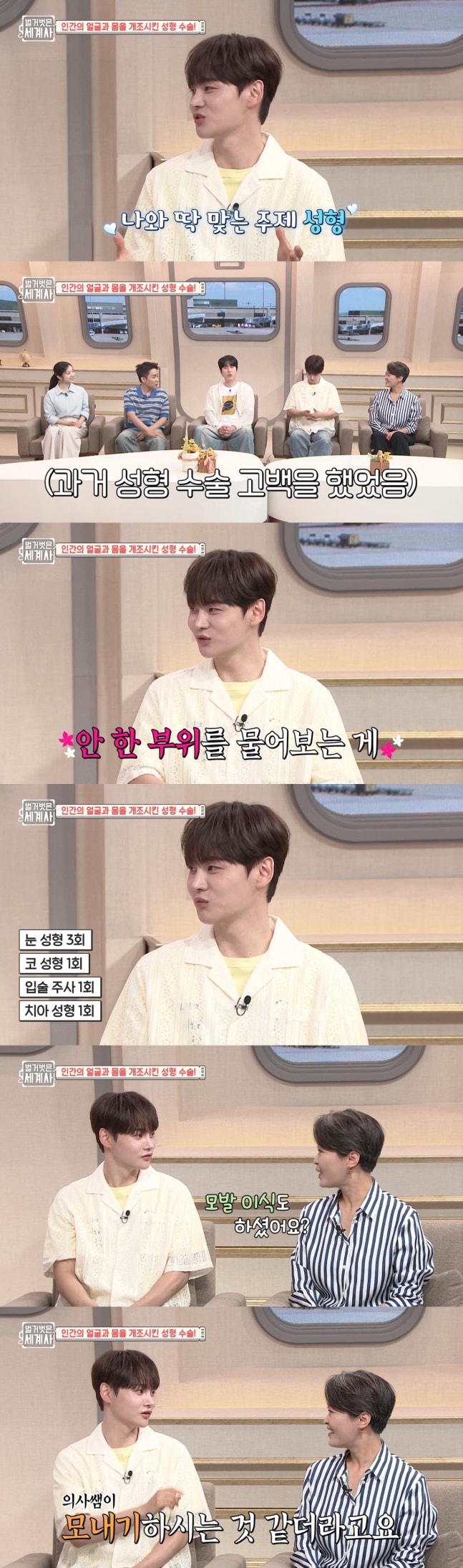 [스포츠조선닷컴 정안지 기자] 가수 박서진이 성형 질문에 "성형 안 한 곳을 물어 보는 게 더 빠를 것"이라며 솔직하게 털어놨다.12일 방송된 tvN '벌거벗은 세계사'에서는 성형수술의 모든 것을 알아봤다.